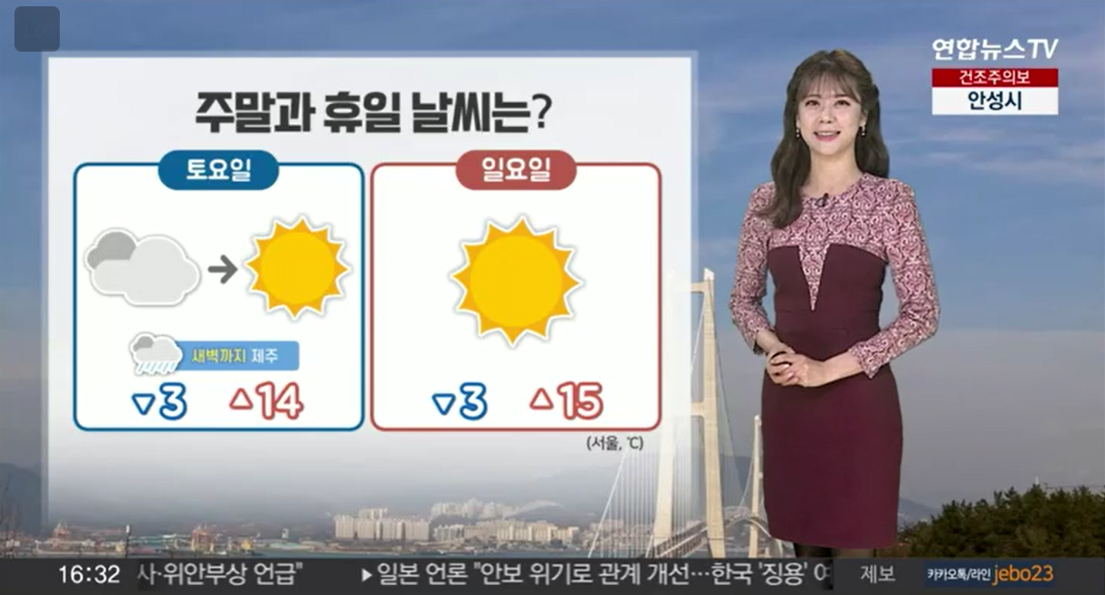 토요일인 오는 18일은 낮 최고기온이 19도에 이르는 등 포근한 날씨를 보이겠습니다. 다만 낮과 밤의 기온 차가 15도 이상으로 매우 커 주의해야 하겠습니다. 특히 수도권과 강원내륙산지를 중심으로 아침 기온이 0도 이하로 내려가는 곳이 있어 아침 옷차림을 따스하게 하셔야 합니다.