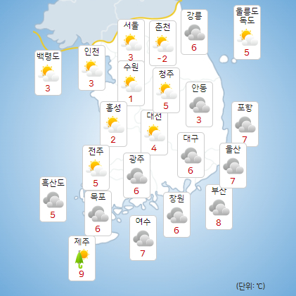 주요 지역 아침 최저기온은 서울 3도, 인천 3도, 수원 2도, 춘천 -1도, 강릉 6도, 청주 5도, 대전 4도, 전주 5도, 광주 6도, 대구 6도, 부산 9도, 제주 9도다.